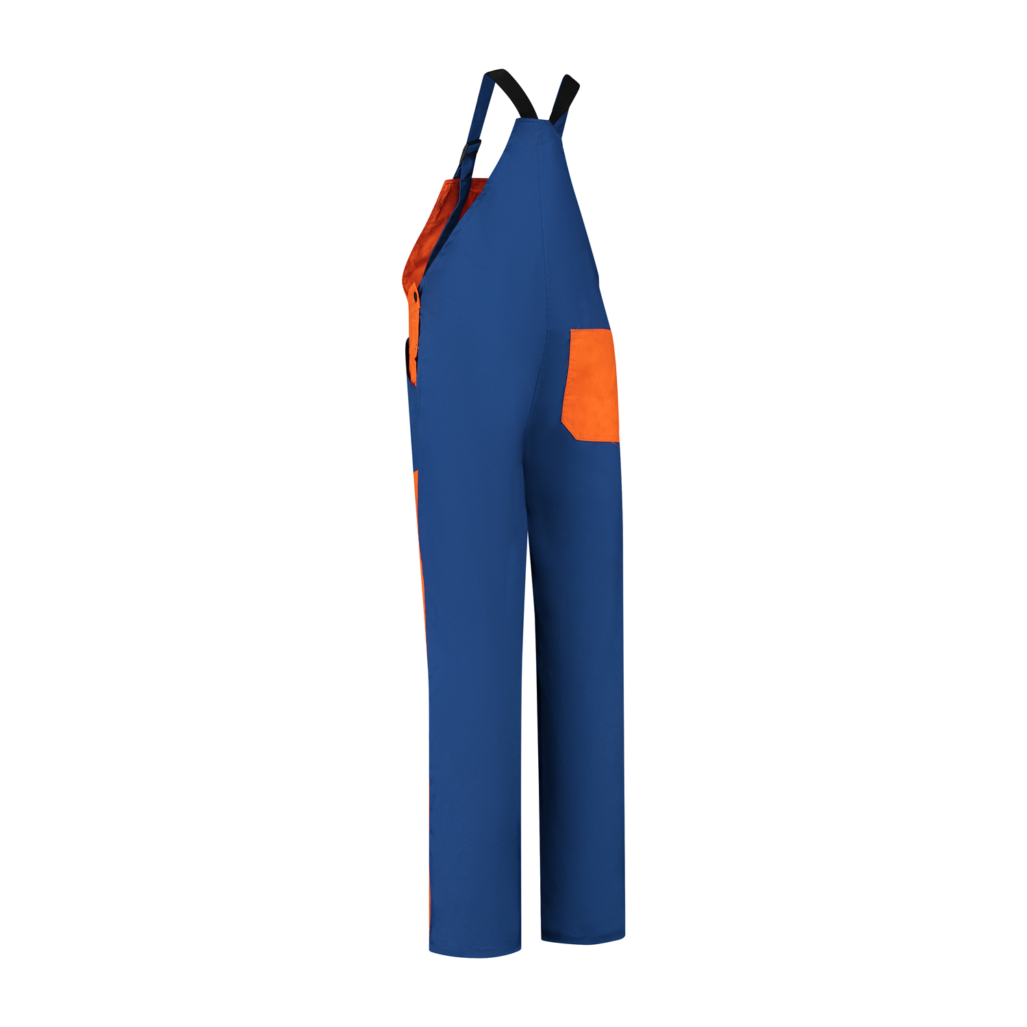 Tuinbroek polyester/katoen, 65% polyester / 35% katoen, 190 gram/m2, 1 grote borstzak met drukknoopsluiting, 2 zijzakken, 2 intasten, achterzak en duimstokzak